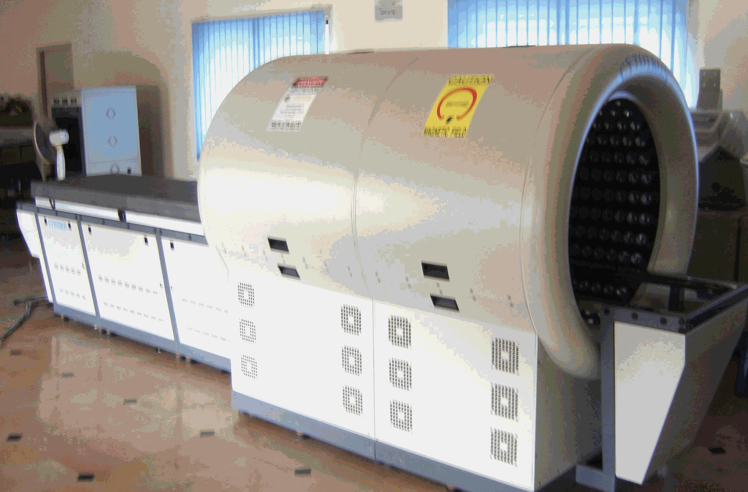 CYTOTRON is a huge machine, which looks like a modern whole body MRI scanner but has a bigger bore. The bore has a gantry, that carries about 864 guns (older versions have 288 guns). Each of the guns produces high instantaneous magnetic field and radio frequency, it also consist of a special near field antenna and parabolic reflectors to deliver these signals. These guns emit packets or Quantum of programmed signals in time and space that are focused to the target of interest using laser guides. These emitted string of packets, which contain the dosimetry required for a specific medical condition is delivered by the antenna. The beams are than rotated in 360 degrees around the target.
